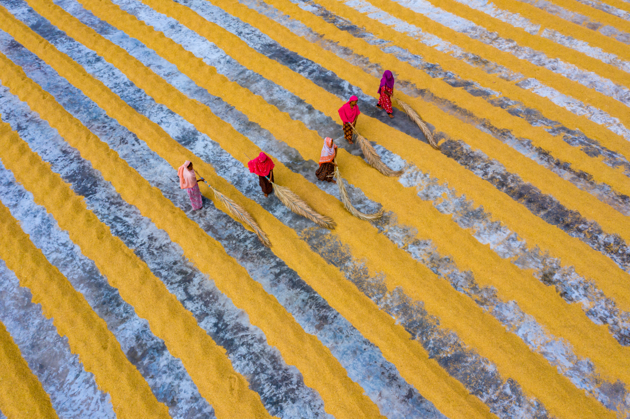 Five women workers use a traditional method to dry paddy in the sun, spreading and turning it with wooden rakes before dividing it into lines with palm branches. This daily practice, lasting up to ten hours, reflects both the vital role of women in sustaining agricultural life and the continuity of farming traditions along the Silk Roads.