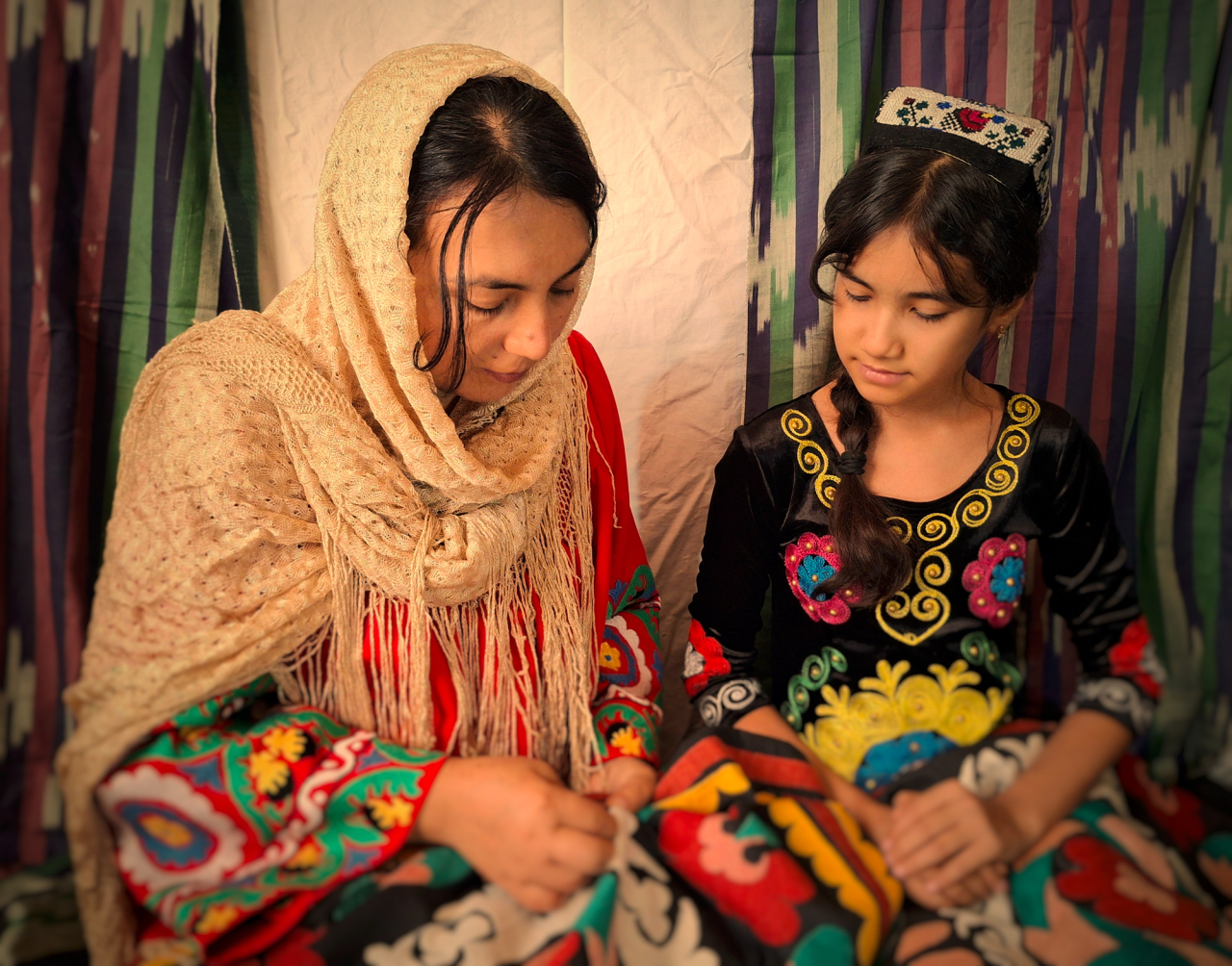 A mother teaches her daughter the art of ‘suzani’ embroidery, a tradition of Silk Roads heritage where every stitch carries the history and care of generations.