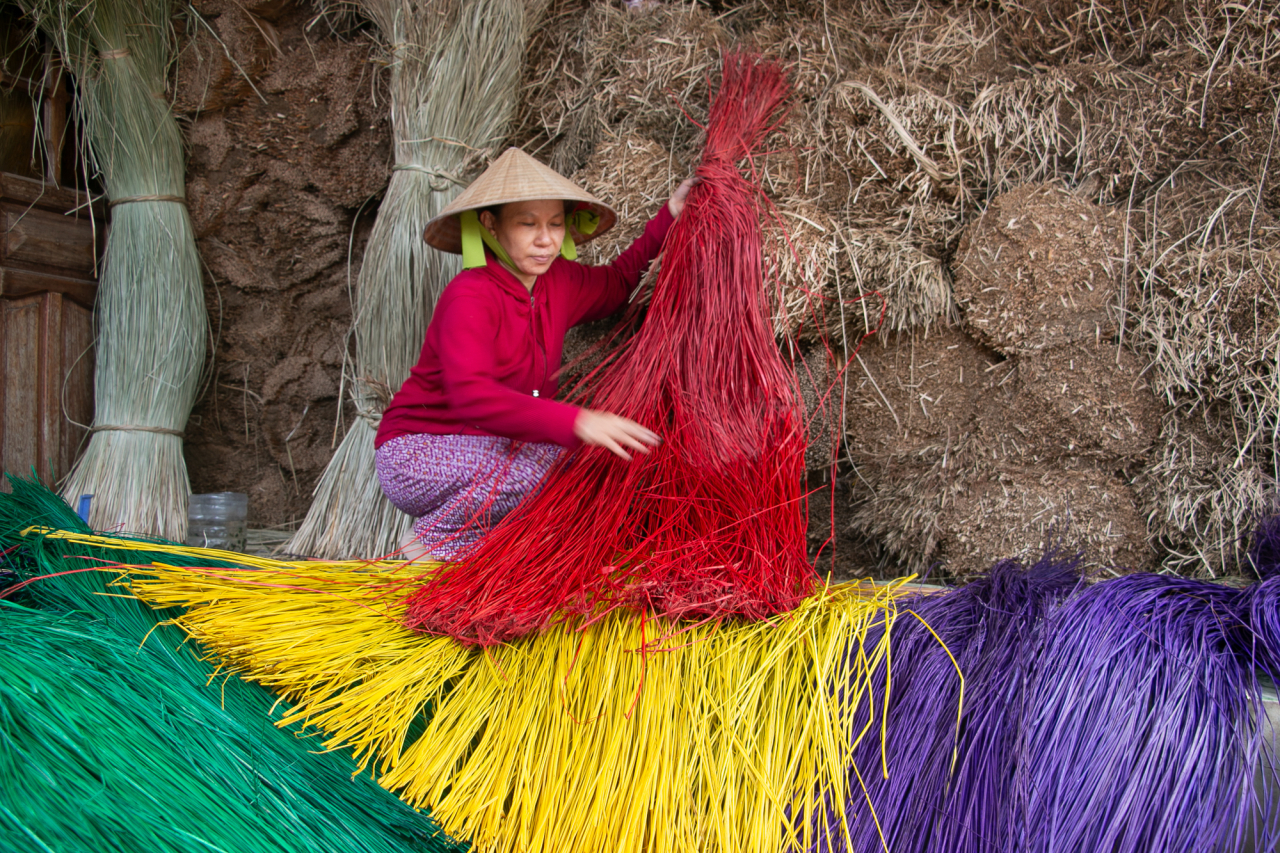 The village of An Cư, in central Viet Nam, has practiced the craft of weaving rush and sedge mats for centuries. In this photo, a woman artisan airs out rush strands after dyeing them in vivid green, purple, yellow, and red. These intricate handicrafts, once traded along the Silk Roads, highlight the significance of Vietnamese cultural heritage and the vital role of women in sustaining these traditions across generations.