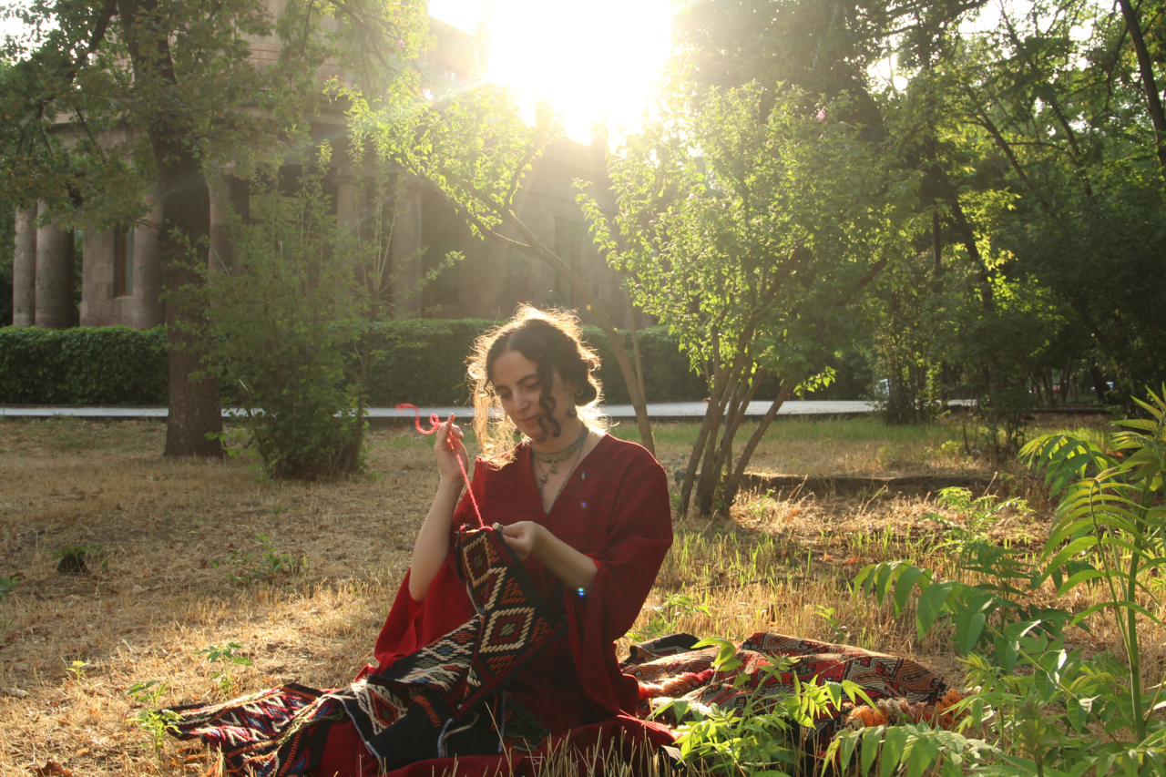 A young woman sits on the grass in a quiet park in Yerevan, Armenia, working on her embroidery. She is wearing a “taraz”, a traditional Armenian dress, and through her hands carries forward the living heritage of craftsmanship sustained along the Silk Roads for generations.